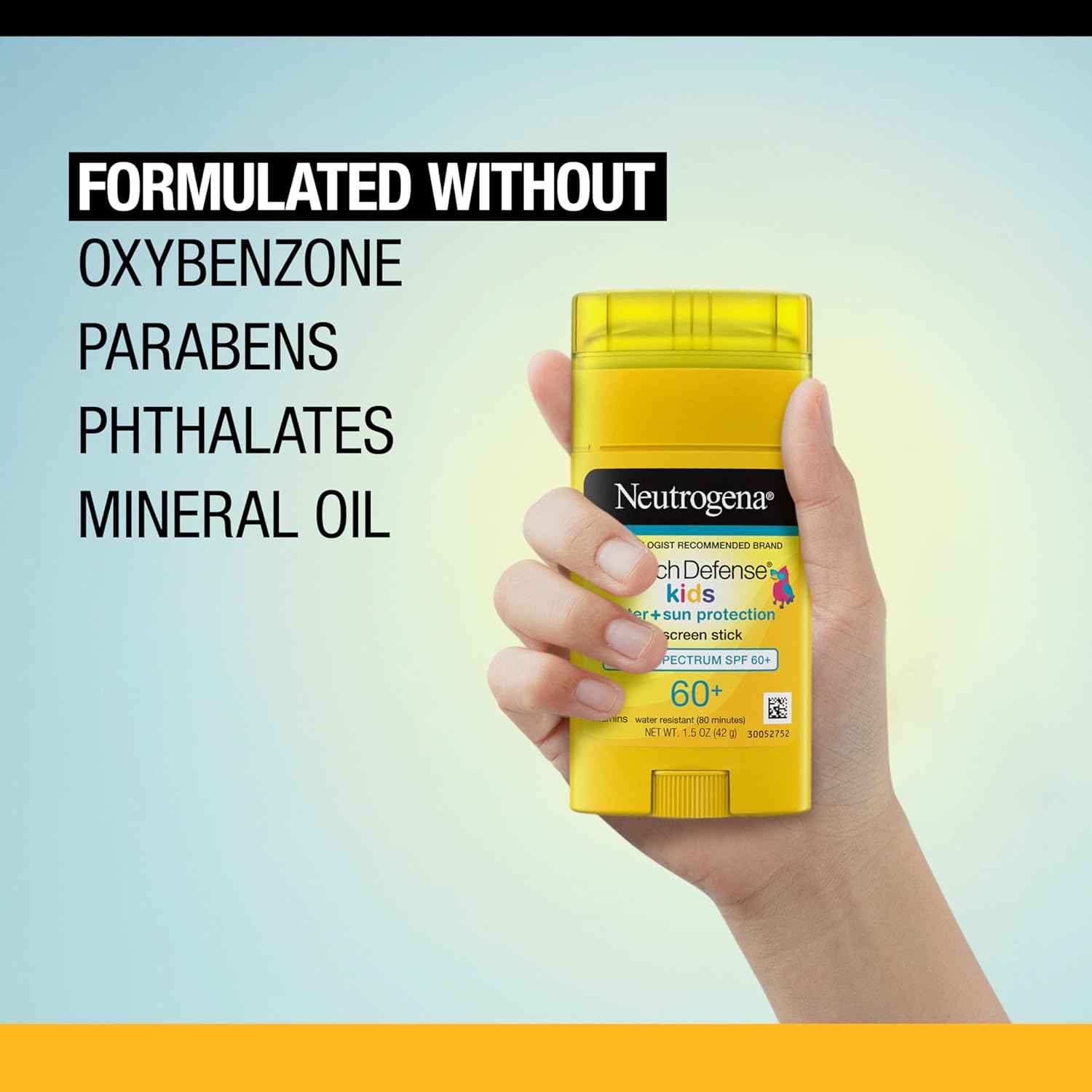 About this item Twin pack of two, 1.5-ounce Neutrogena Beach Defense Kids Sunscreen Sticks with broad spectrum SPF 60+ for 80 minute water-resistant sun protection from harmful UVA and UVB rays Made for kids, this body and face sunscreen stick provides beach strength sun and water protection for your children The children’s sunscreen stick for face and body is formulated with broad spectrum SPF 60+ and is water-resistant for up to 80 minutes, making it a perfect addition to your beach bag From a dermatologist-recommended brand, this facial sunscreen stick features a lightweight formula that is easy to apply, oxybenzone free and formulated with the antioxidant multi-vitamins C and E Apply prior to sun exposure to protect your child’s skin at the beach or during any other outdoor activities. Reapply after 80 minutes of swimming or sweating, immediately after towel drying and at least every 2 hours
